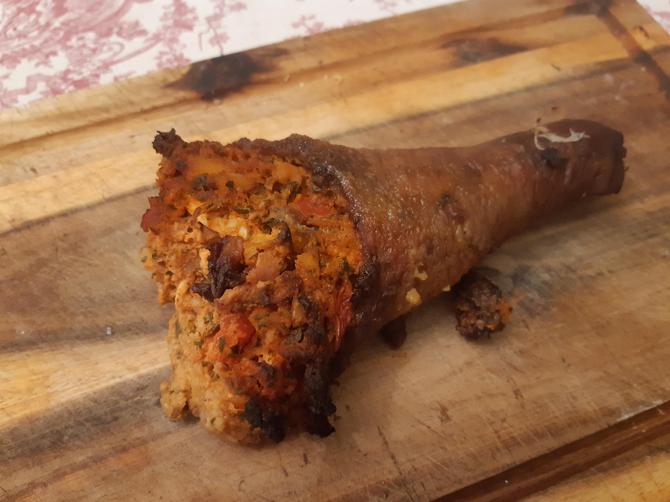 A saját receptem: Tölteléket készítünk. A hűtőszekrény maradék sonka volt, amelyet felkockáztam (kb. 10 dkg). 4 tojást keményre főztem. (Lobogó vízbe egy kanállal engedtem bele a tojásokat, 10 percig főttek, majd hideg vízben feltörtem a héjakat és hagytam a hideg vízben lehűlni. Így a héjakat két mozdulattal leválaszthattam a főtt tojásokról, nem kellett szenvedni a hámozással.) A tojásvágóval két irányból is felvágtam a kemény tojásokat, és egy mély tálba raktam őket a sonkakockákkal együtt. Zabpehellyel és egy kiskockázott paradicsommal gyúrtam össze a masszát. Lazításnak egy kanál liba/kacsazsír. Só, sok petrezselyem, bors, őrölt pirospaprika és köménymag. (Magyaros ízek.) Gondolkodtam a vöröshagymán, de végül nem tettem bele. A tölteléket betettem a hűtőbe (30 perc), hogy keményedjen, tömörebb legyen. Igyekeztem formásra tölteni a libanyakat, másodjára sikerült is. A sütőben 200 fok C hőmérsékleten 40 percig sütöttem fedő nélkül. A színe barnás-pirosas lett, a külső része kopogósra pirult. A tálaláshoz éles kés szükséges. Én az asztalnál vágtam fel, hogy a vendégek egyben is szemlélhessék a libanyakat. Köretnek bármi jó hozzá, én kacsazsírral könnyített krumplipürét gondoltam, csípős csalamádéval.